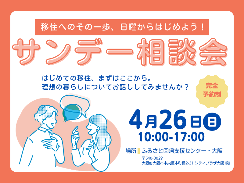 「どんな地域?」「どんな人が住んでいるの?」「どんな生活になる?」 そんな疑問や不安は個別相談会やセミナー、フェアへ参加して解消!当センターで開催される”移住・定住・いなか暮らし”に関するセミナーや関西圏で開催されるイベント(セミナー・交流会・相談会・フェア)へまずは参加してみてみよう♪
