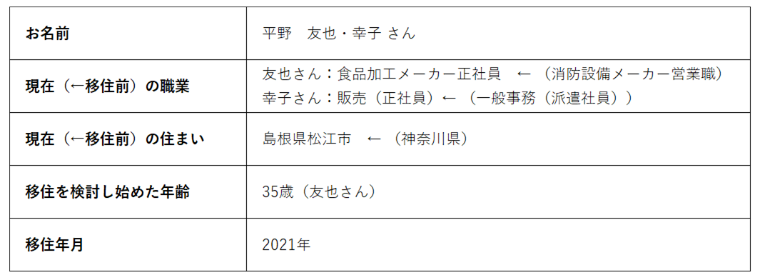 自然の中で子どもを育てたいと、妻・幸子さんの故郷である島根県への移住を検討。夫・友也さんは当初、島根県に住むイメージが湧かなかったが、都内で開催された島根県のUIターンフェアに足を運び、移住者の体験談を聞くうちに心境が変化。「こういう人生もありかもしれない」と思い始めた。