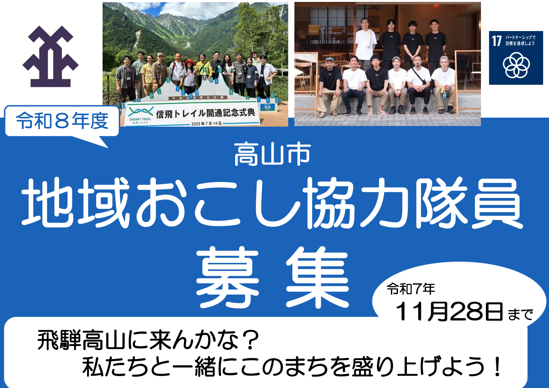 高山市では、地域の活性化に意欲ある若者を「地域おこし協力隊員」として受け入れ、受け入れ先となる高山市内各地域の団体と一緒に活動してもらい、外部・若者からの視点による新しい地域の魅力の発掘や、地域の活性化に向けた新たな取り組みを企画・提案し実施いただくことで、地域(団体や住民)が主体となって取り組む地域の活性化に向けた活動を促進するとともに、持続可能な地域づくりにつなげます。