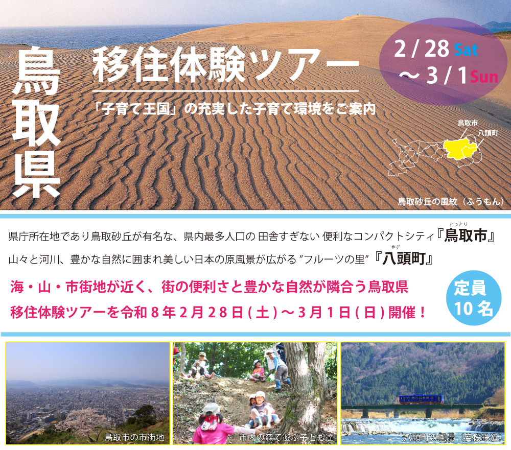 2月28日(土)~3月1日(日)、鳥取県の東部エリア1市1町を1泊2日で巡る移住体験ツアーを開催!「子育て王国」鳥取の充実した子育て環境をご案内します。
