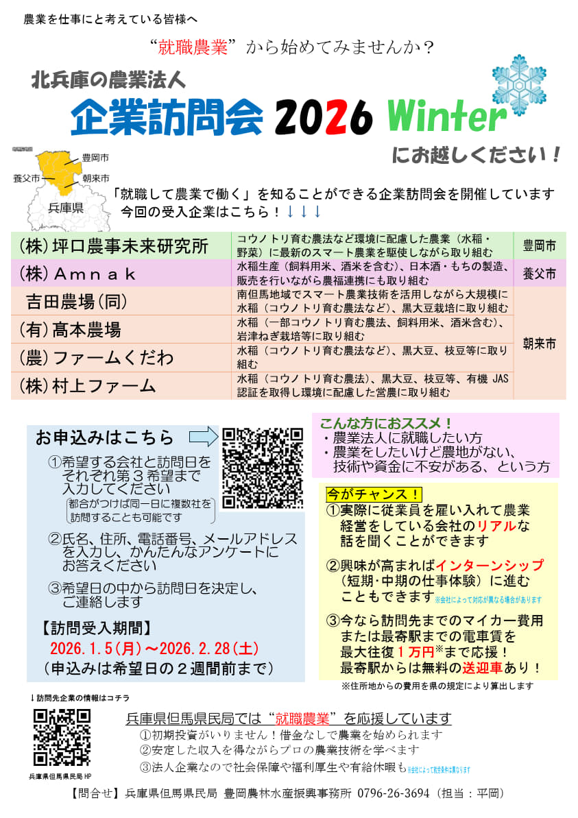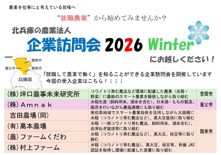 但馬地域(豊岡市・朝来市・養父市)で、実際に従業員を雇用して農業経営をしている農業法人のリアルな話を聞くことができます。