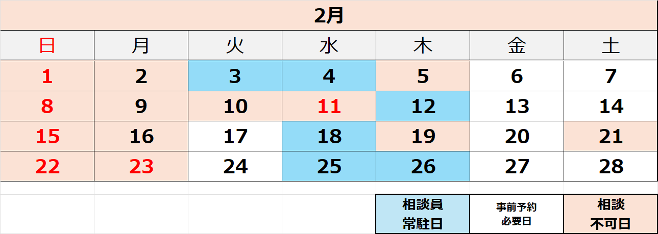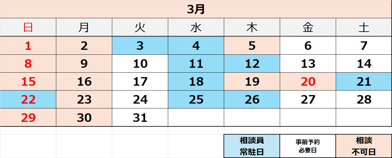 *相談員常駐日(予約優先)→ 水色