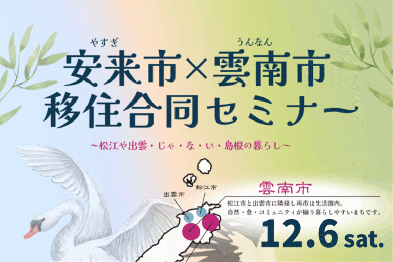 安来市×雲南市、初の合同移住セミナーを開催! 松江市と米子市(鳥取県)に挟まれた【安来市】と松江市と出雲市が隣接する【雲南市】。 どちらも自然豊かでありながら地方都市部を生活圏内として暮らすことができる、良いとこ取りの地 … 続きを読む ★おすすめ★