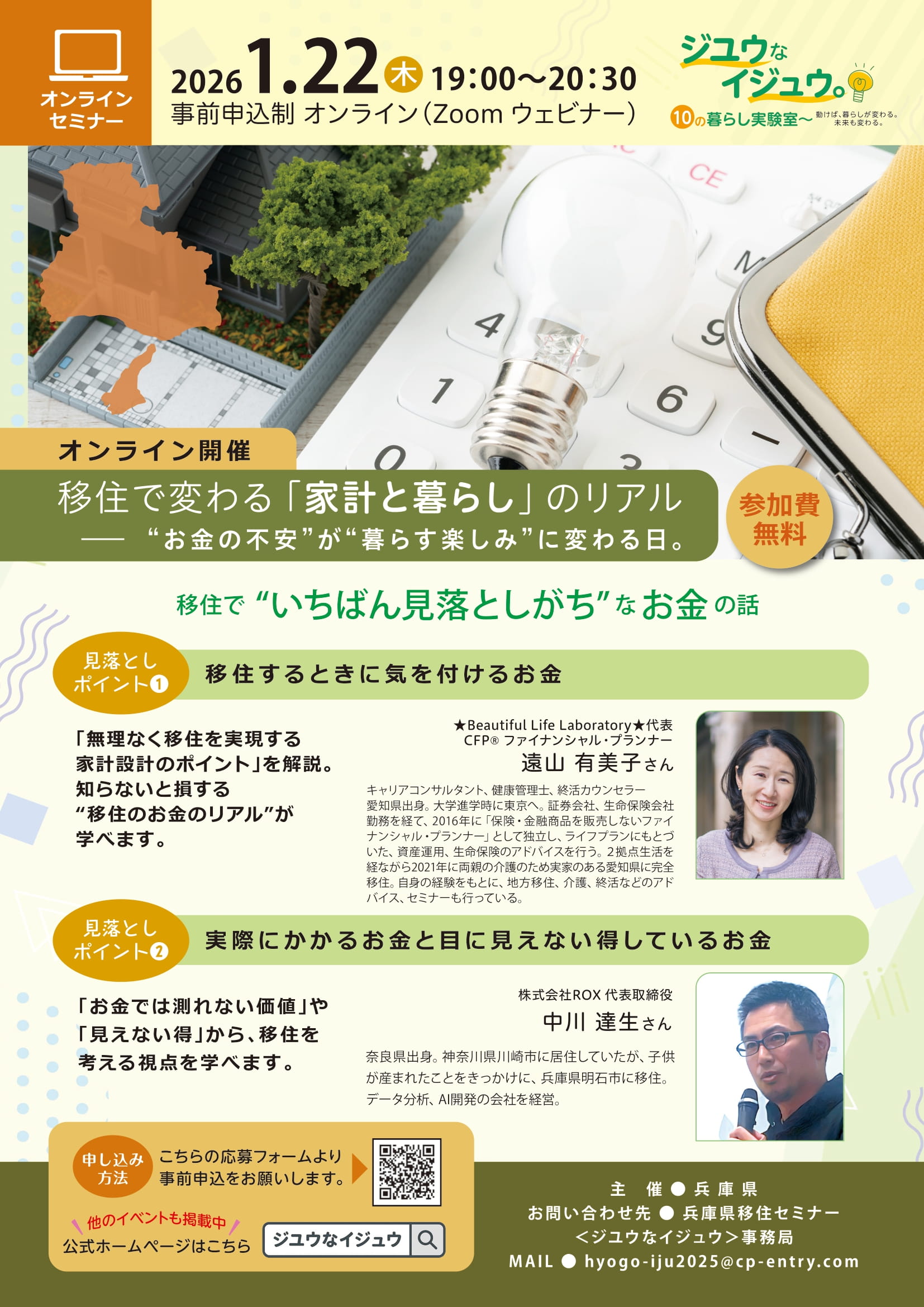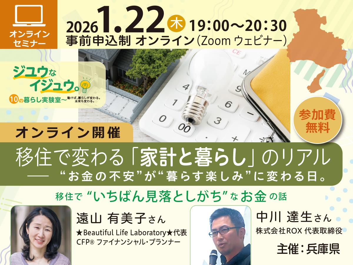 1月22日(木)にオンラインにて、兵庫県主催移住セミナー「移住で変わる「家計と暮らし」のリアル―“お金の不安”が“暮らす楽しみ”に変わる日。」を開催します!