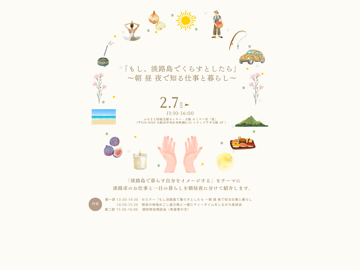 「淡路島で暮らす自分をイメージする」をテーマに、淡路市のお仕事と一日の暮らしを『あさ』『ひる』『よる』に分けて紹介します。セミナー後には個別移住相談もあります。